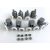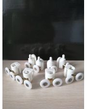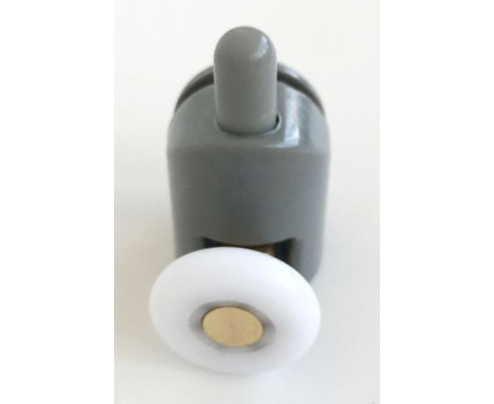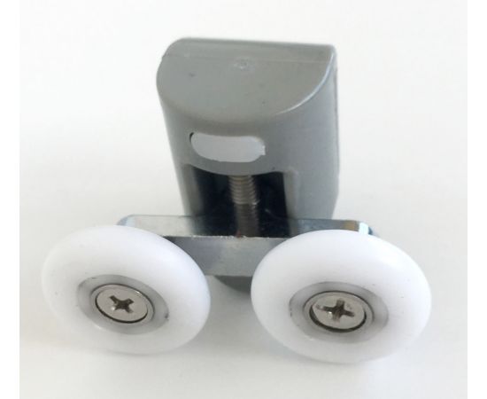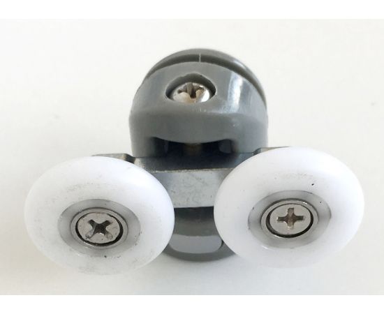 комплект серого цвета из 4-х двойных шарнирных подвесных (верхних) роликов с регулировкой винтом по высоте и 4-х одинарных шарнирных подпружиненных нижних роликов. D ролика 23 мм D отверстия в стекле 10 мм Вынос от центра ролика до центра стекла 25 мм Высота от края стекла до центра отверстия 18 мм