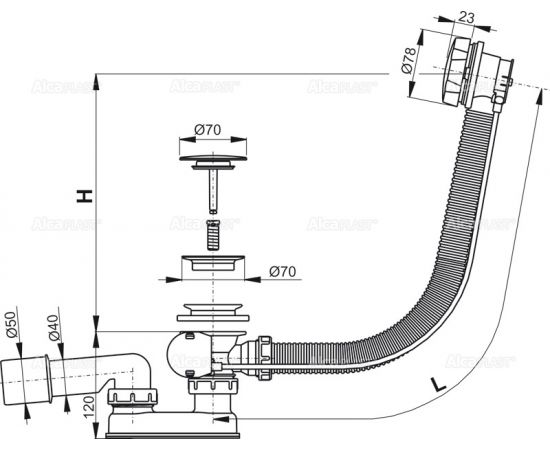 A55KM Сифон для ванны автомат комплект металл 57 см ALCA